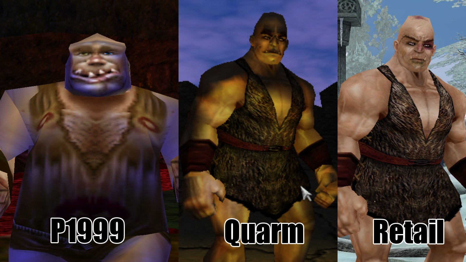 The game is 27 years old, and luckily the devs have updated the models and game engine as time went on.  But the third expansion (Luclin) had a huge overhaul on models specifically.  Below you can see a comparison of how an Ogre shadow knight looks between Project 1999, Quarm, and retail.